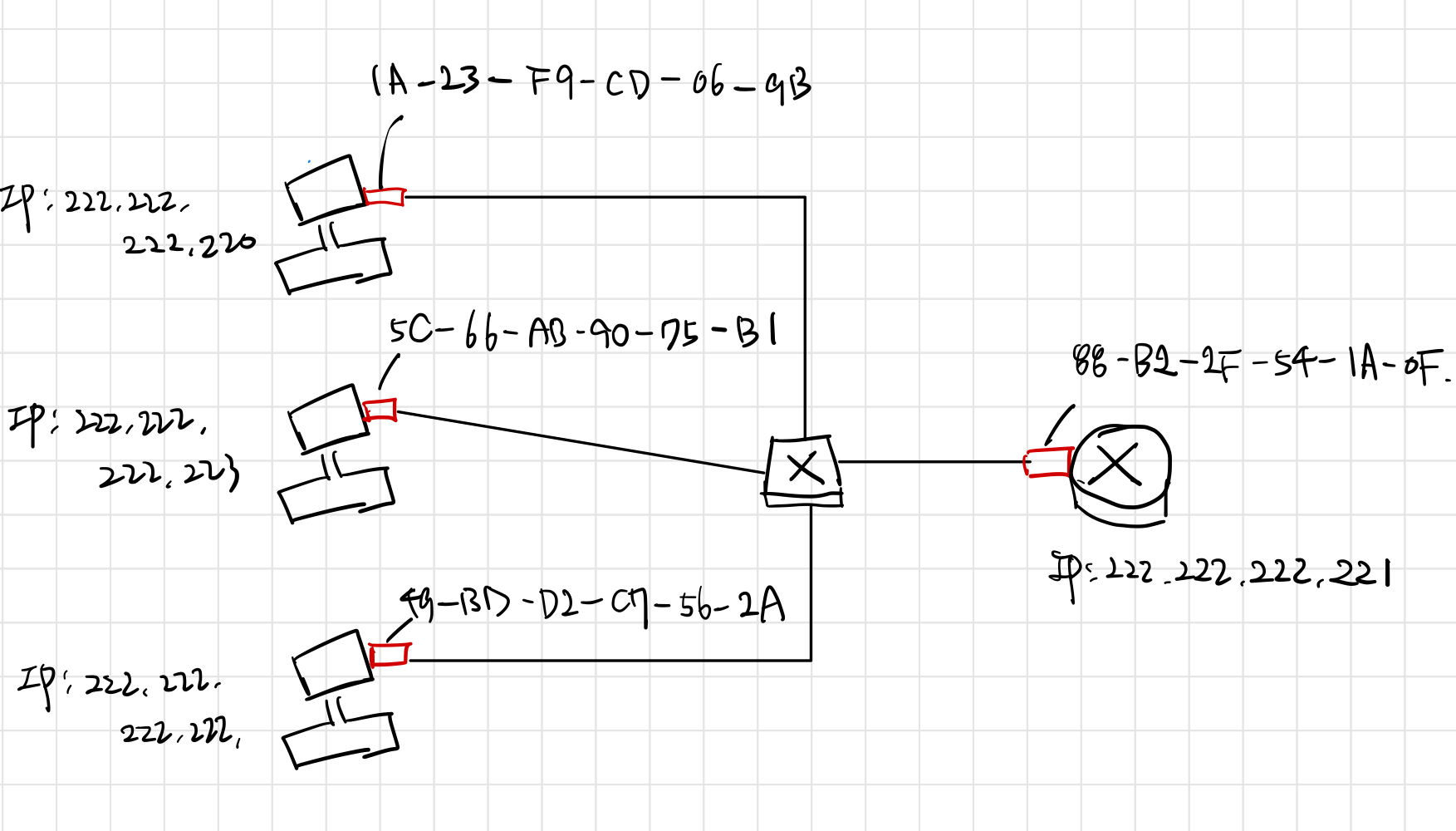 위 그림의 상황에서 IP 주소 222.222.222.220을 가진 호스트가 동일한 서브넷에 존재하는 호스트 222.222.222.222로 IP 데이터그램을 전송한다고 해보겠습니다.