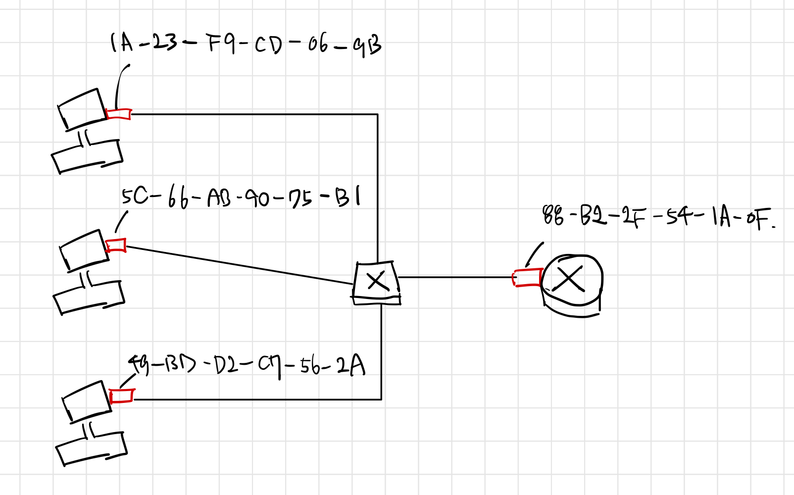 아래 그림을 보시면, 스위치에는 링크 계층 주소가 할당되어 있지 않고 각 호스트나 라우터에만 링크 계층 주소가 할당되어 있는 것을 보실 수 있습니다.