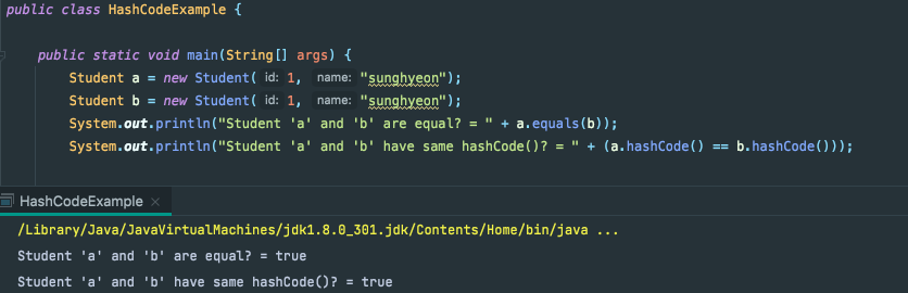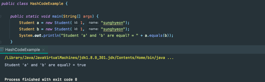 위에서 만든 Student 클래스를 가지고 아래와 같이 두 객체가 같은지를 비교해보면 학번과 이름이 모두 같기 때문에 Student a, b는 같은 객체임을 볼 수 있습니다.