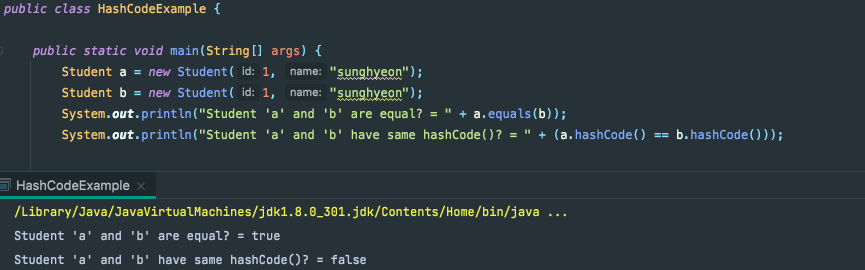 그런데, 이 부분에서 문제가 생깁니다. 학생 a, b가 같은 객체라면 a와 b에 대한 hashCode() 메서드도 같은 값을 리턴해야 하는데 hashCode()의 결과값은 각각 다른 값을 갖는다는 것입니다.