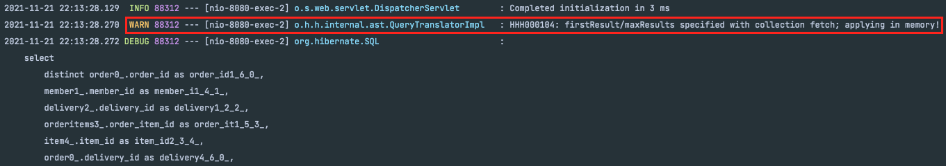 따라서 실제로 페이징 쿼리를 함께 실행해보면 아래와 같이 WARN 경고 로그를 남기고 모든 데이터를 DB에서 읽은 뒤 페이징을 시도하게 됩니다.