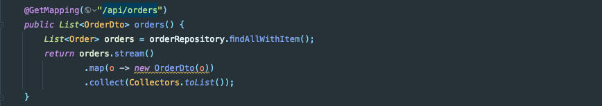 주문 목록을 보여주는 OrderDto는 아래와 같습니다. 주문번호와 주문한 회원의 이름, 주문날짜와 상태, 주소, 그리고 주문상품을 가집니다. 여기서 주문상품의 목록 역시 OrderItemDto 필드로 만들었으며, OrderItemDto는 주문상품명과 가격, 수량을 필드로 갖습니다.