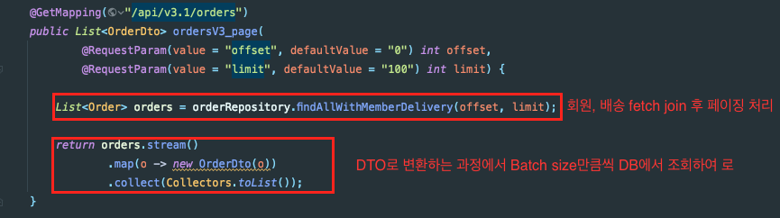 다만, 위에서 말한 컬렉션 엔티티에 대한 조회를 할 때에는 hibernate.default_batch_fetch_size를 적용하여 페이징 처리를 할 수 있습니다.