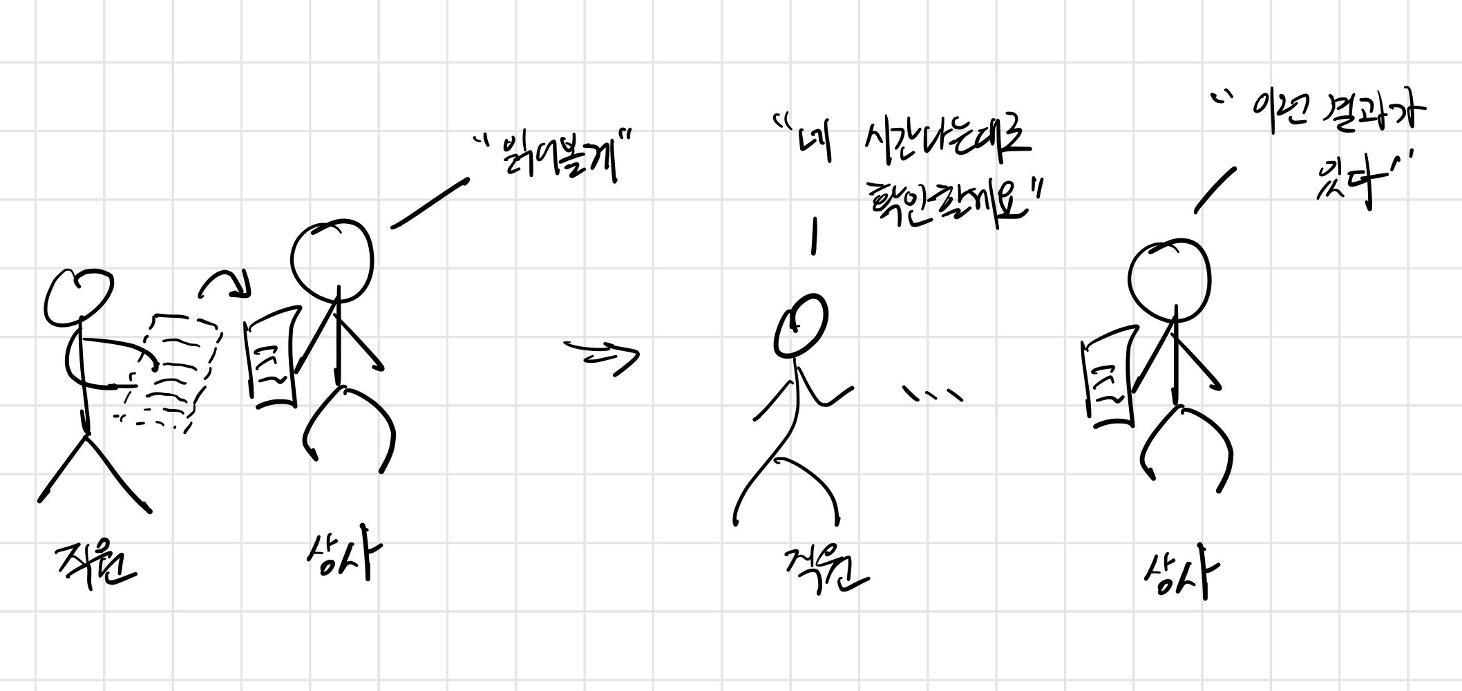 Synchronous은 Blocking/Non-Blocking의 개념이 아니기 때문에 상사가 서류를 읽는동안 직원이 기다리든, 다른 일은 하든 아무런 상관이 없습니다. 단, 상사가 서류를 다 읽고 결과를 리턴해주면 직원은 바로 그 결과에 관심을 갖게 됩니다.