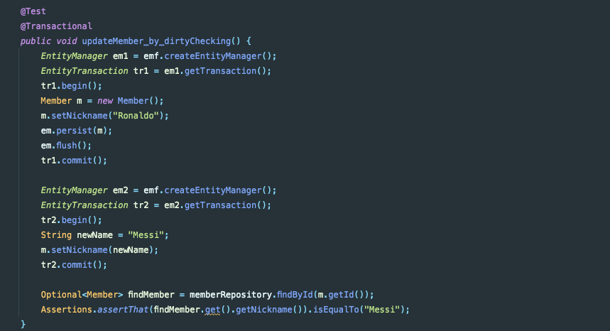 먼저 두 개의 EntityManager와 각각의 트랜잭션을 따로 만들었습니다. 그리고 "Ronaldo"라는 이름의 회원을 만들어 DB에 저장하고 트랜잭션을 커밋했습니다.