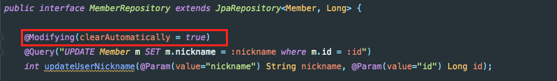 @Query("UPDATE Member m SET m.nickname = :nickname where m.id = :id")