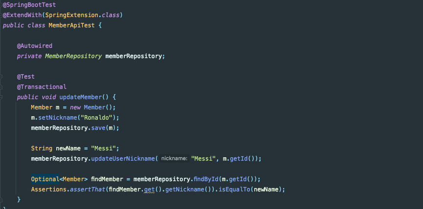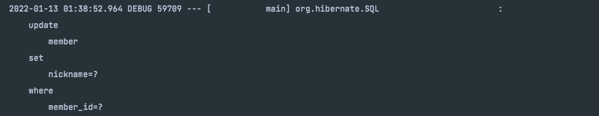 어쨌든 위와 같이 회원(Member)의 닉네임을 바꾸는 쿼리를 JPQL을 이용해 작성했습니다.
