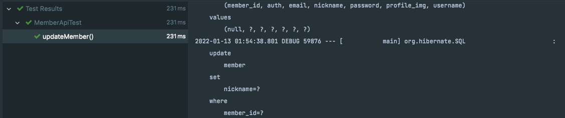 그런데 아이러니하게 아래 사진과 같이 update 쿼리는 정상적으로 나가는 것을 볼 수 있습니다. 테스트코드가 실패한 이유는 무엇일까요?