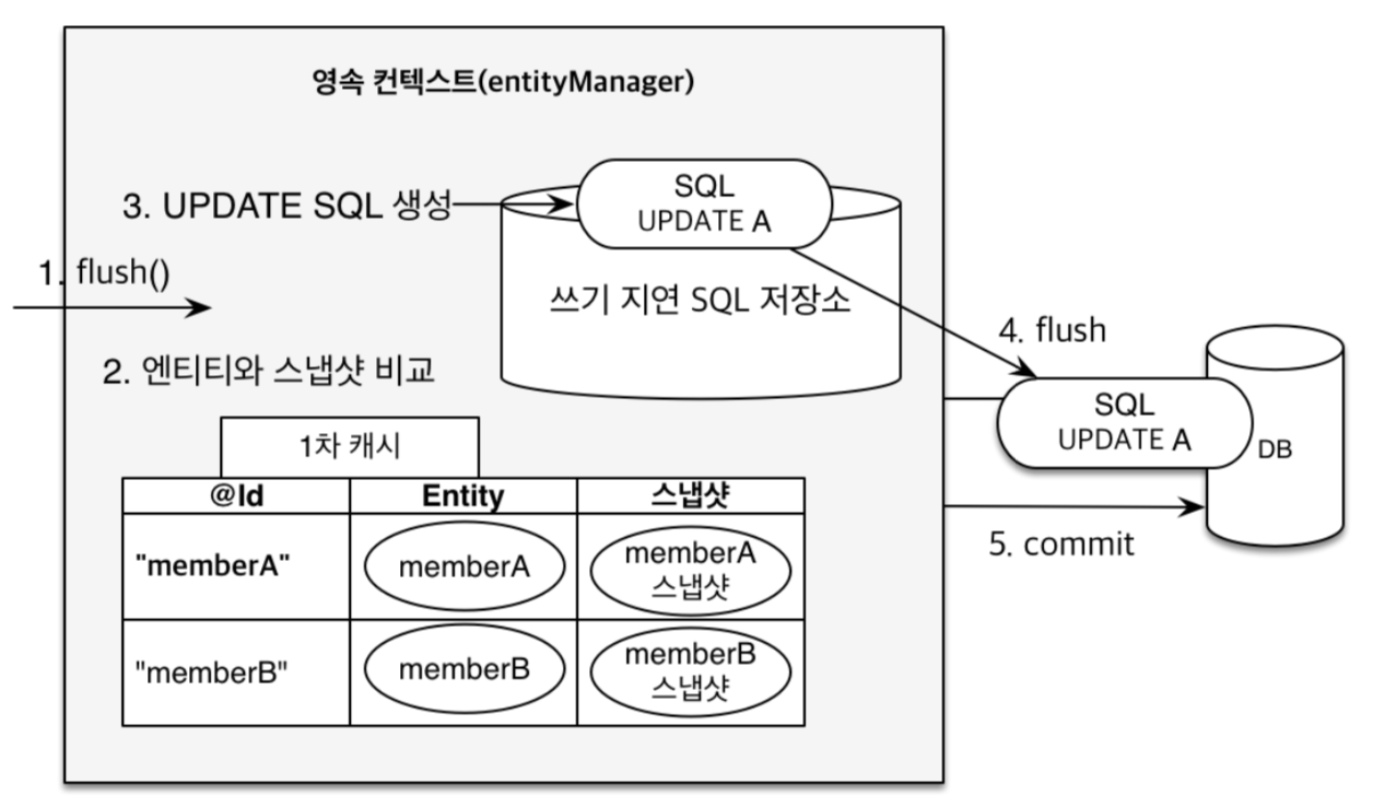JPA는 엔티티를 영속성 컨텍스트에 보관할 때, 최초 상태를 복사해서 저장하는데 이것을 스냅샷이라고 합니다. 그리고 flush 시점에 스냅샷과 엔티티를 비교해서 변경된 엔티티를 찾죠.