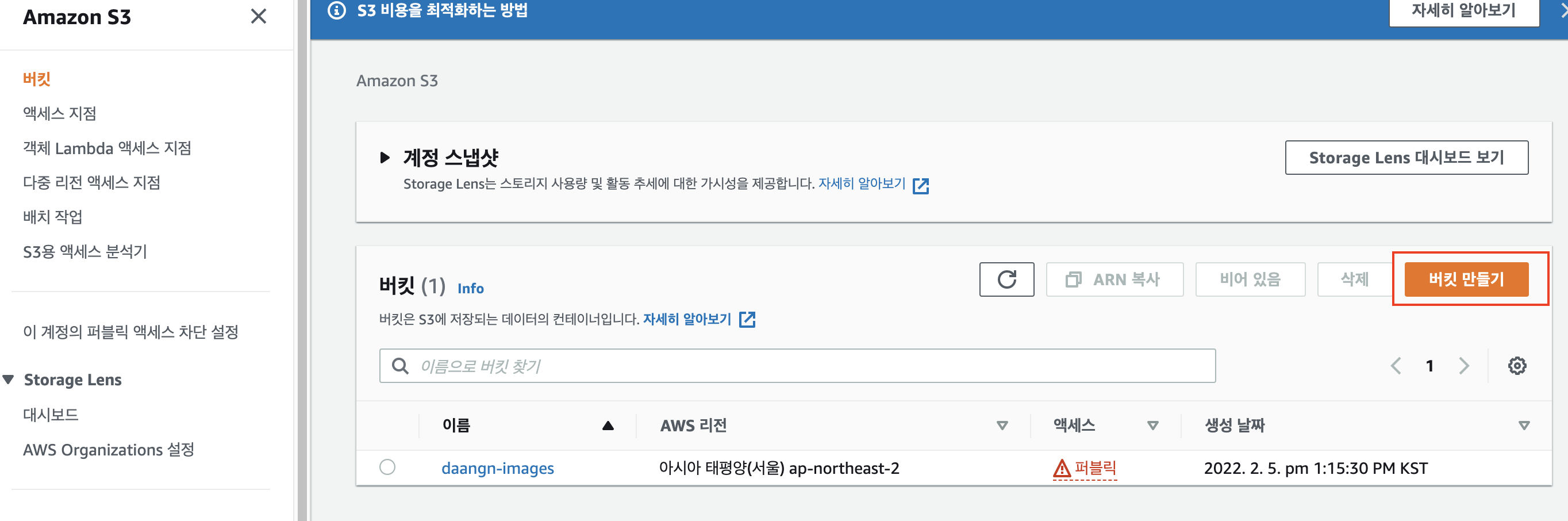 [1] 먼저 아래와 같이 Amazon S3에 접속해서 버킷 만들기를 선택해줍니다. 아래 daangn-images라고 만들어진 버킷은 제가 기존에 만들어둔 버킷이니 무시하셔도 됩니다.