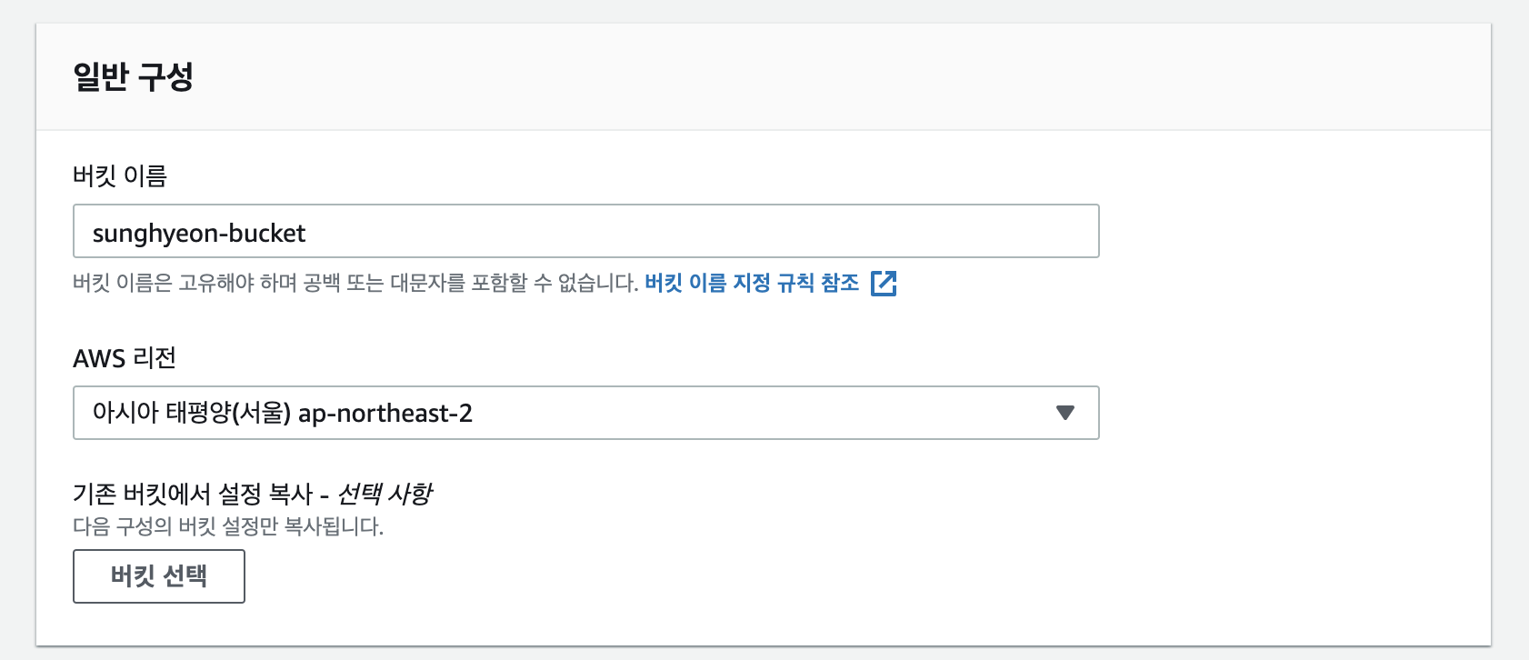 [2] 아래와 같이 버킷 이름을 입력하고, AWS 리전은 ap-northeast-2(서울) 기본값을 선택합니다.