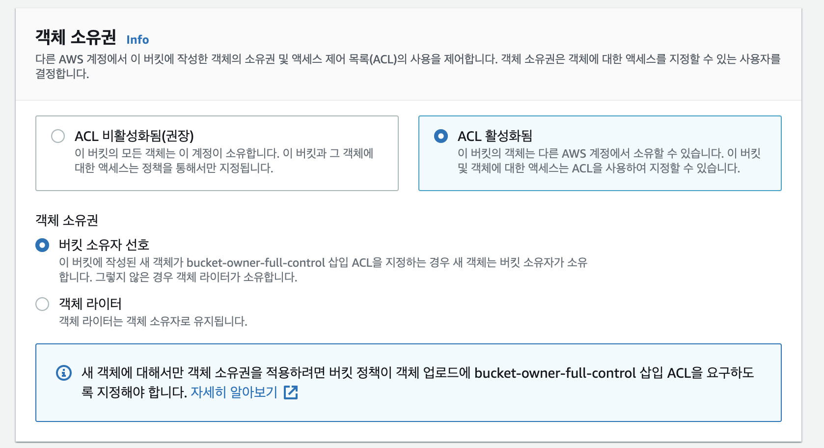 [3] 객체 소유권에서 ACL 활성화됨을 선택해주고, '버킷 소유자 선호'를 선택해줍니다.