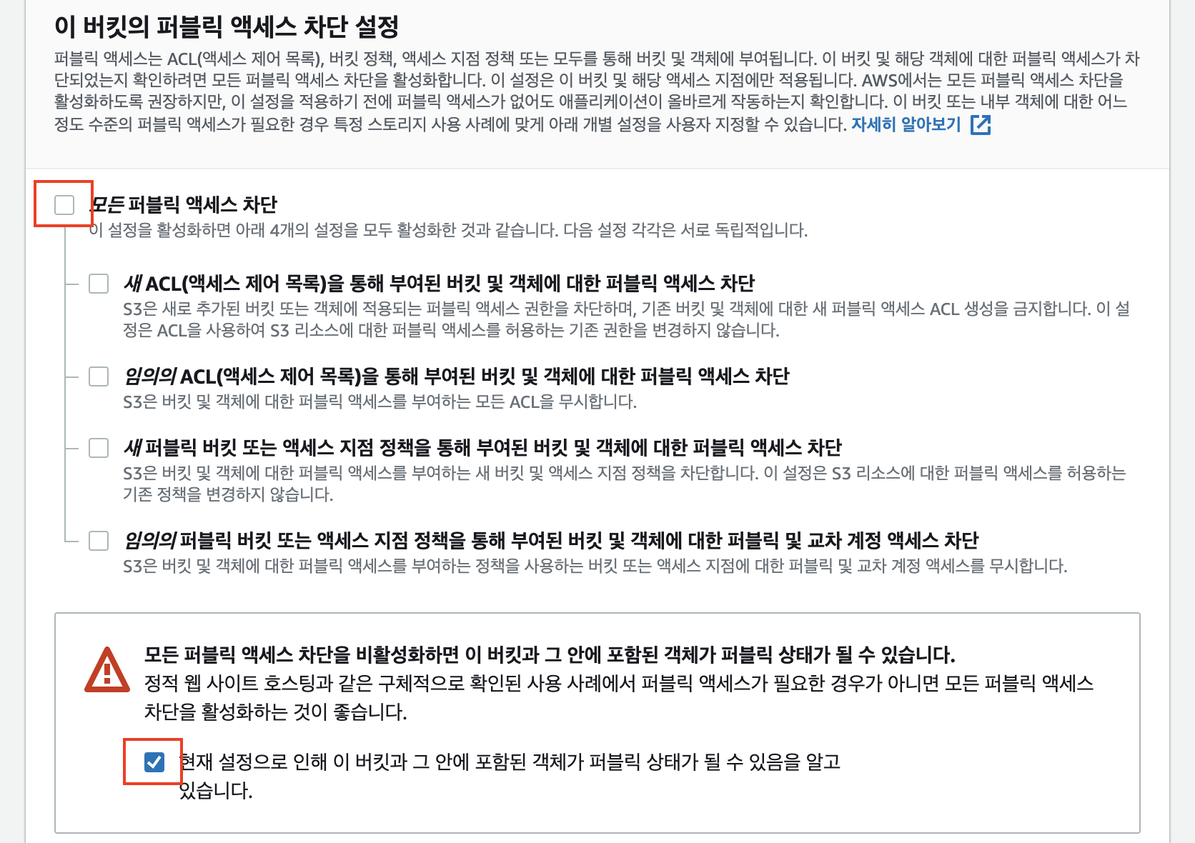 [4] 그 이후에는 '이 버킷의 퍼블릭 액세스 차단 설정'이라는 항목이 있는데요. 해당 항목의 체크를 '해제'해줍니다. 퍼블릭 액세스가 차단된 상태면 나중에 Access Denied 에러가 발생할 수 있습니다.