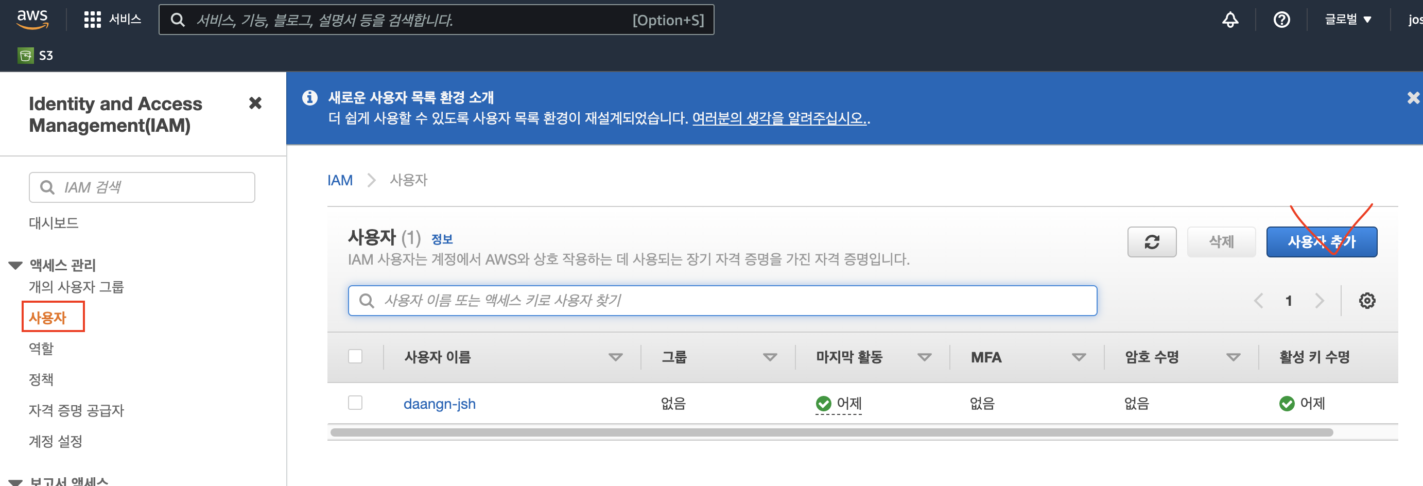 이제 생성된 버킷을 관리할 수 있는 IAM 사용자를 만들어야 합니다.