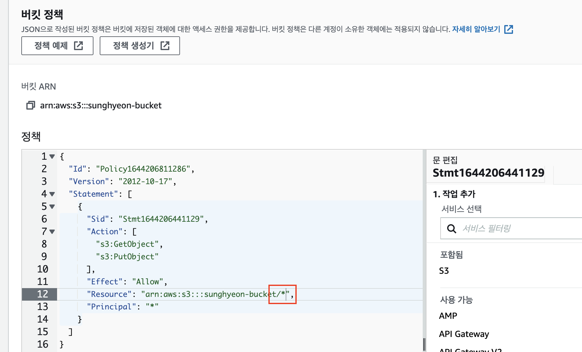 복사한 내용을 '버킷 정책 편집' 창에 붙여넣기한 뒤, Resouce 부분의 마지막에 '/*'를 추가하고 변경 사항을 저장합니다.