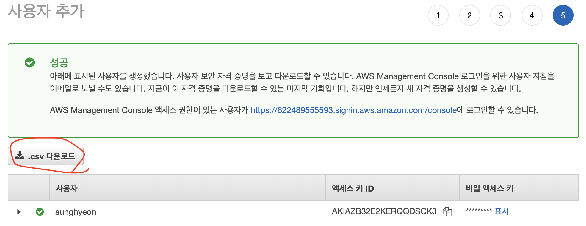 이제 더 설정할 것 없이 사용자 생성을 완료하고, 마지막 화면에서 액세스 ID, PASSWORD를 제공하는 csv 파일을 다운로드합니다. 나중에 Springboot에서 해당 Id, Pw를 통해 IAM 사용자임을 확인하고, 버킷에 접근할 예정입니다.