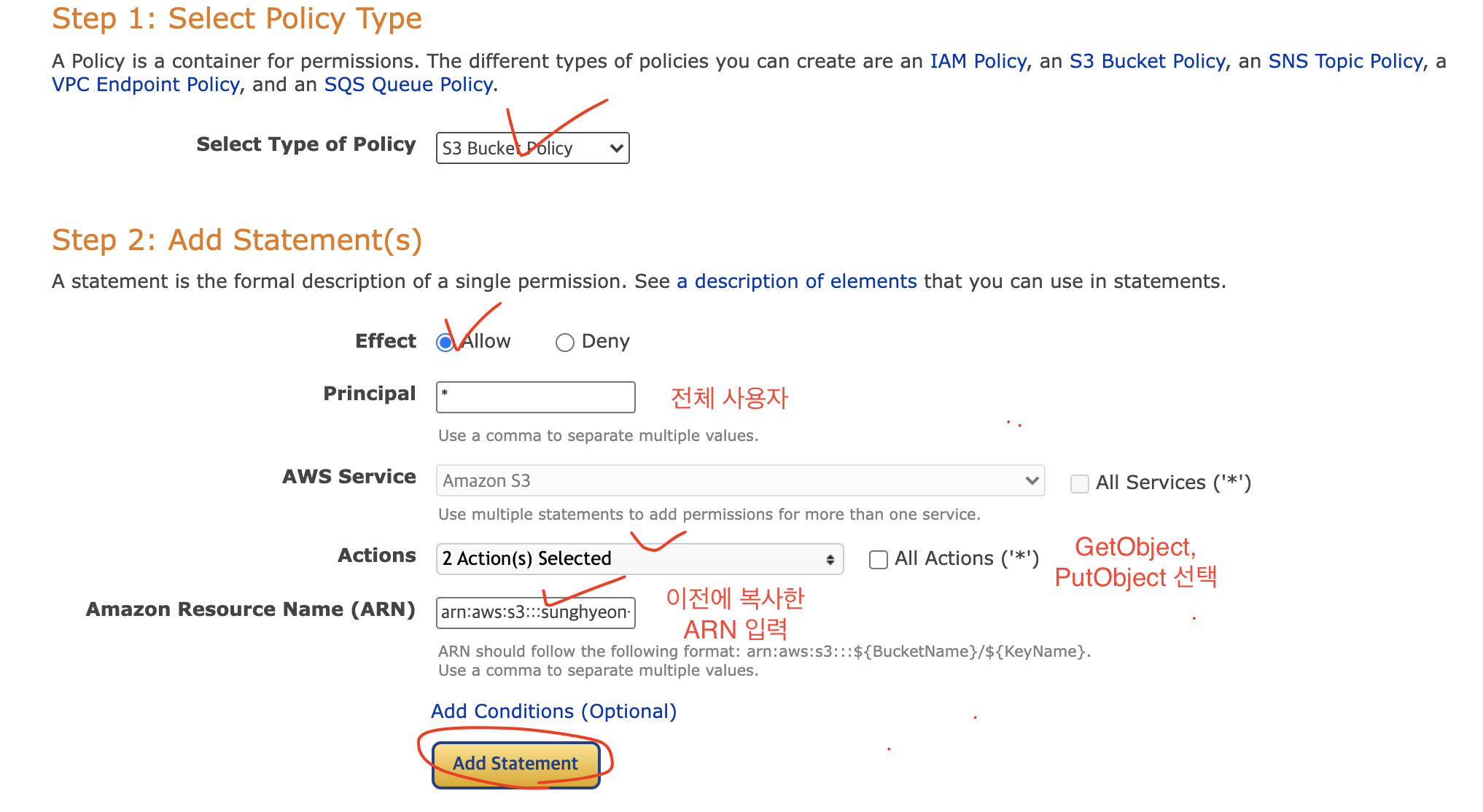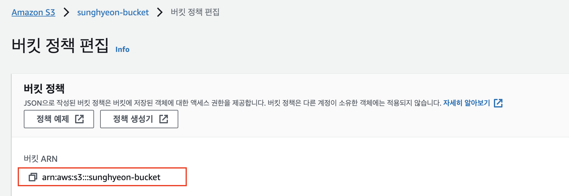 [1] 생성한 버킷 선택 > 권한 > 버킷 정책에 있는 '편집' > 정책 생성기로 들어갑니다. 이 때, '버킷 정책 편집' 화면에서 버킷 ARN을 확인할 수 있는데요. 이 부분을 복사해둡니다.
