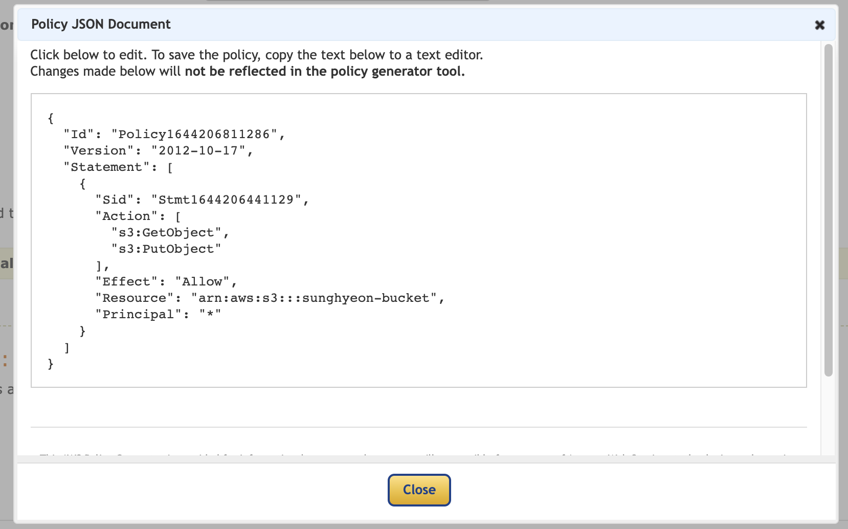 이제 'Add Statement' 버튼을 누르고 'Generate Policy' 버튼을 클릭하여 정책 생성을 완료합니다. 그러면 아래와 같이 JSON 형태의 정책이 나오는데요. 이 내용을 복사해줍니다.