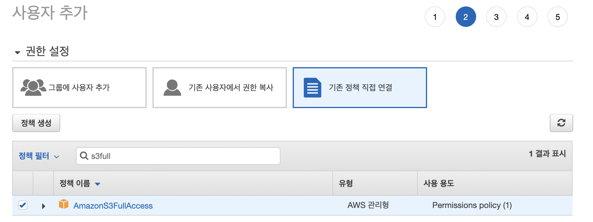 그 다음에 권한 설정에서 '기존 정책 직접 연결'을 클릭해주시고, 정책 필터에서 AmazonS3FullAccess를 선택해줍니다. 이름 그대로 AWS S3 버킷에 대한 전체적인 접근을 허용하는 정책입니다.
