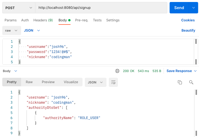 'josh96' 이라는 회원을 등록했고, signup 메서드에 따라 기본 권한은 'ROLE_USER'로 설정되었습니다.