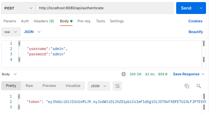 http://localhost:8080/api/authenticate 를 POST로 호출하고, Request Body에는 로그인을 위한 username, password을 넣어줍니다. admin 유저는 이전에 만들었던 data.sql을 통해 자동으로 Database에 저장된 유저 입니다.