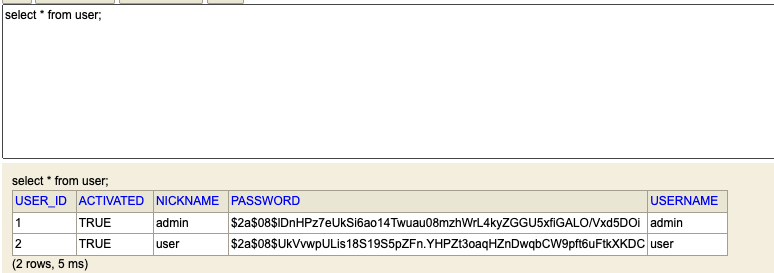그러면 아래 sql 내용에 따라 두 명의 유저(admin, user)와 두 개의 권한(ROLE_USER, ROLE_ADMIN)이 만들어지고, 각 유저에 권한을 매핑해주게 됩니다.