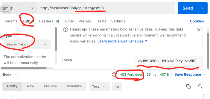 이제 위에서 받아온 token 값을 가지고 josh96 회원이 '/api/user/{username}' API를 호출하는 상황을 보겠습니다.