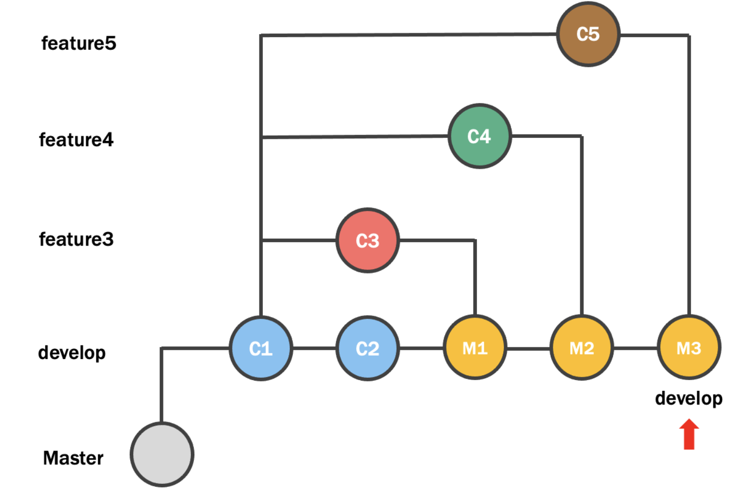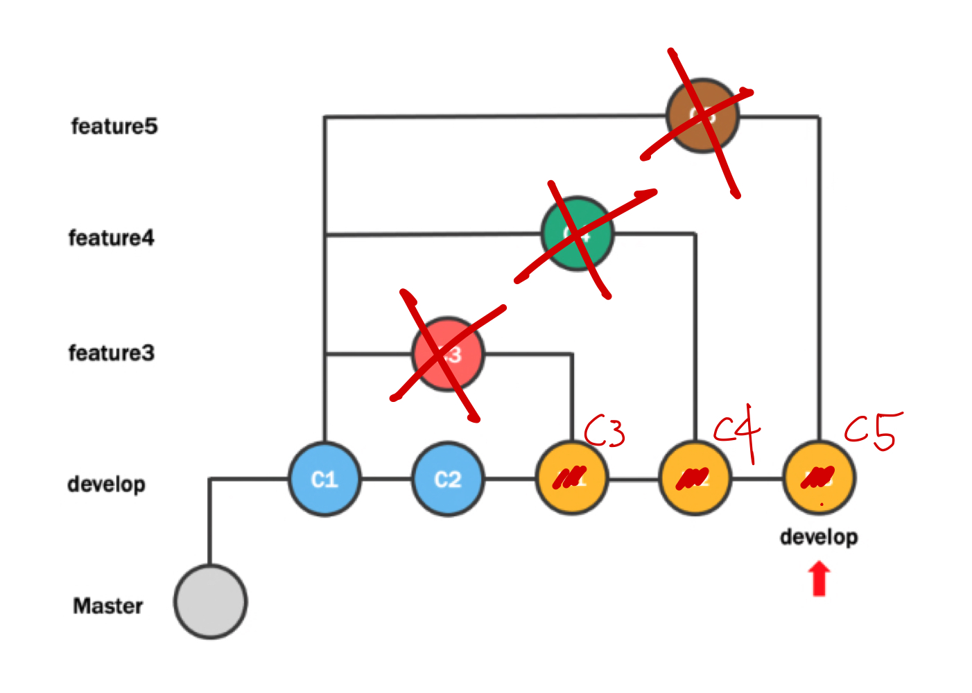 위 그림은 C1 단계에서 feature 3, 4, 5 브랜치를 생성하고, 각 feature 브랜치에서 기능을 개발한 뒤 develop 브랜치와 Merge하는 상황입니다. 이러한 Commit 기록의 의도는 분명합니다. feature 브랜치에서 작업한 내용들을 develop 브랜치에 반영하는 것이죠.