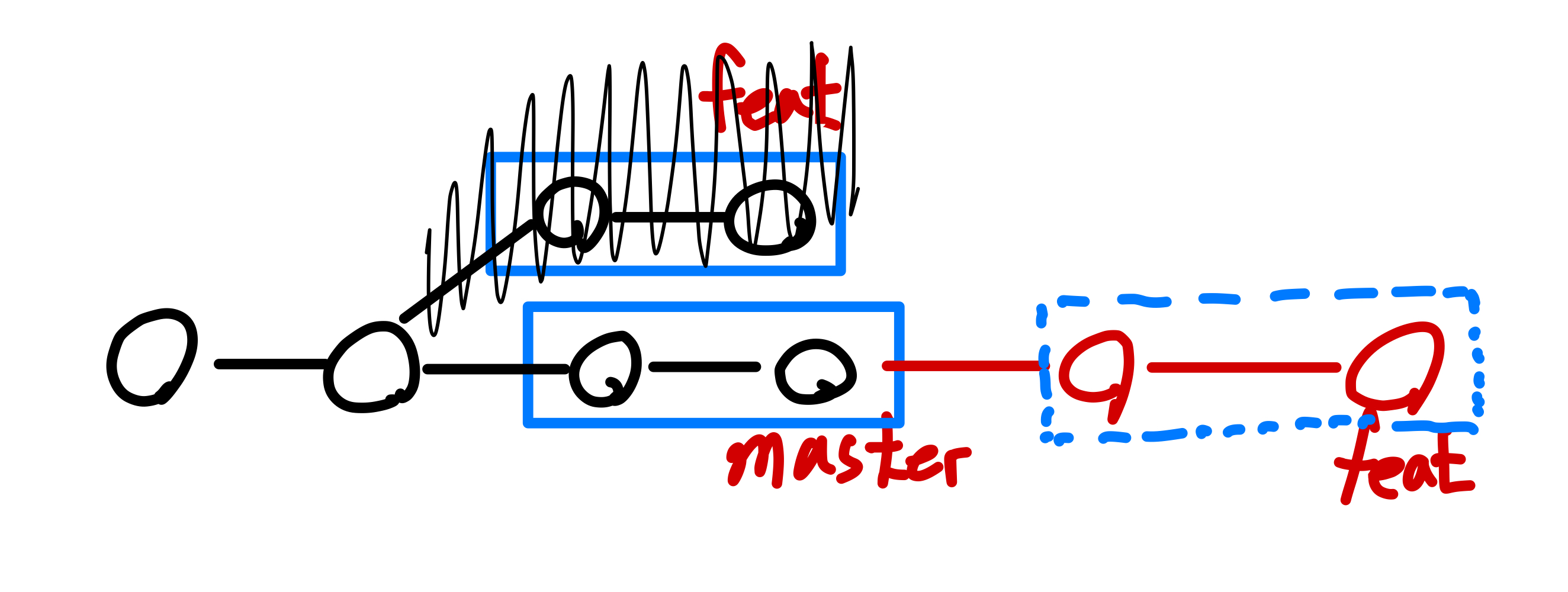 한편, 이 상황에서 Rebase를 사용하게 되면 아래와 같이 feat 브랜치의 Commit 히스토리가 사라지고, 새로운 Commit이 아닌 Master 브랜치의 Base를 기준으로 새로운 뿌리가 뻗어나가게 됩니다.