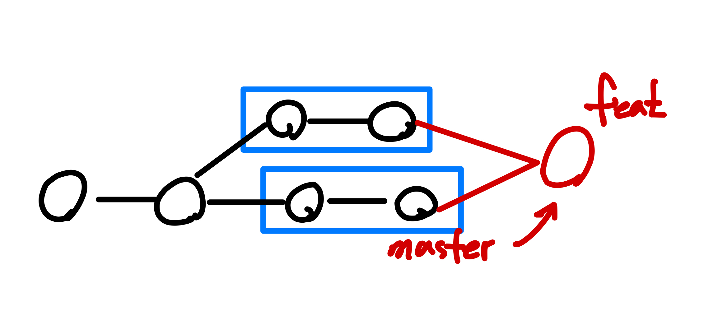 그러면 아래와 같이 병합(Merge)을 통해 master와 feat의 최신 Commit을 공통의 조상으로 하는 새로운 Commit을 생성할 수 있습니다.