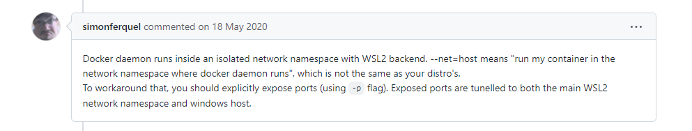 해당 코멘트의 요지는 현재 Docker가 동작하는 환경이 WSL2 Backend에 위치하며, --net=host 옵션은 컨테이너가 동작하는 위치를 Docker가 동작하는 환경과 동일하게 둔다는 것입니다.