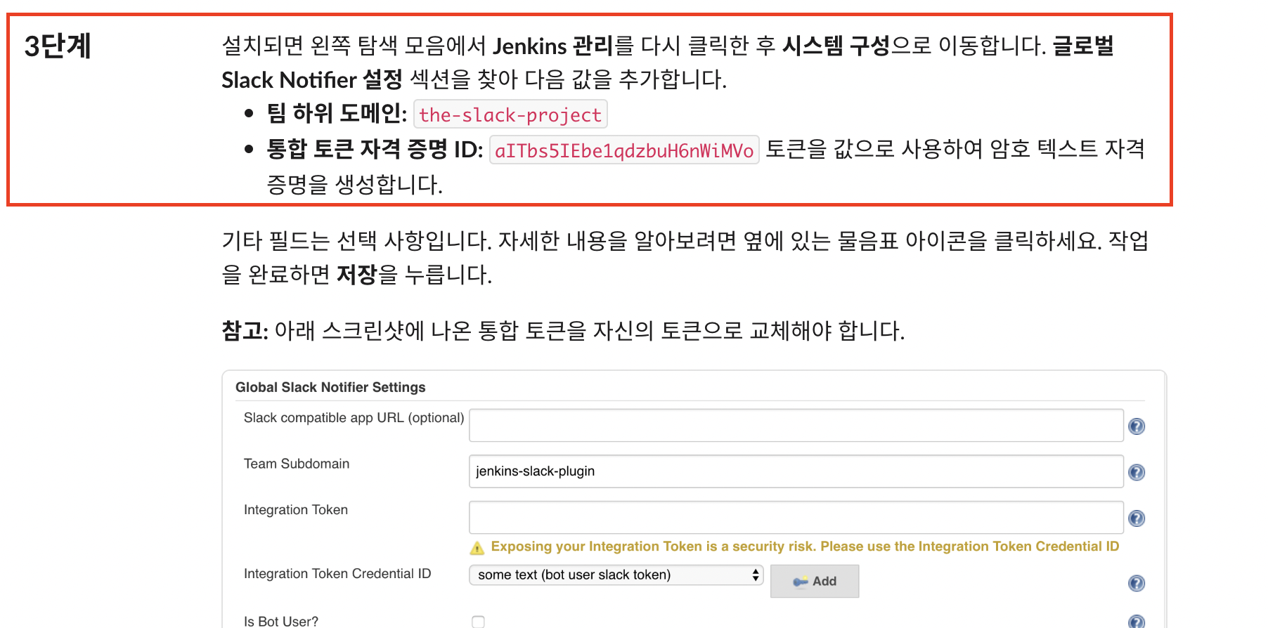 Jenkins 설치를 진행하다보면 아래와 같은 화면이 나올텐데요. 해당 화면에서 팀 하위 도메인과 통합 토큰 자격 증명 ID를 잘 저장해주세요.