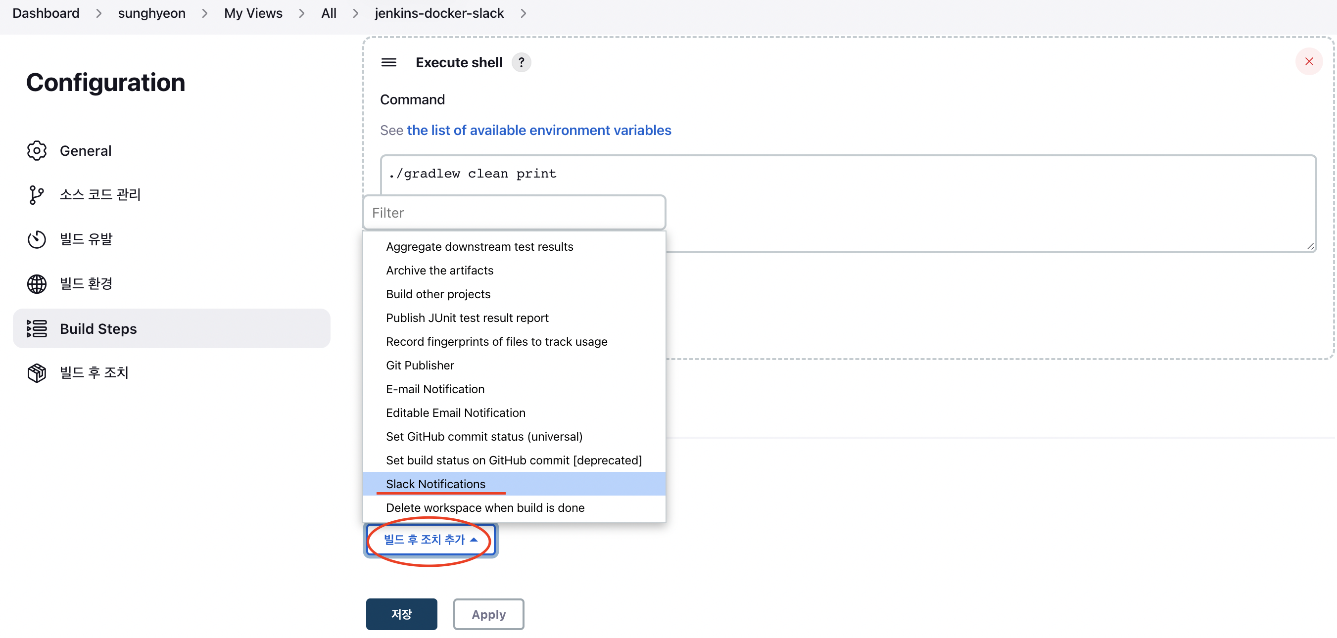 여기까지 진행하셨다면 이제 Jenkins 쪽 설정을 하나 더 해주시면 끝입니다. 바로 빌드 후에 Slack에 알림을 보내겠다는 설정인데요.