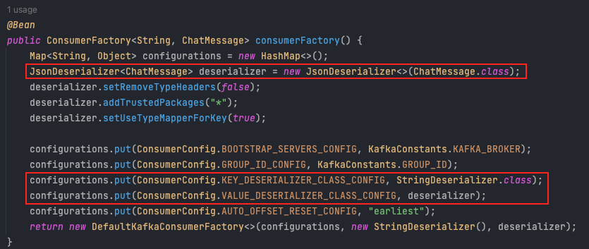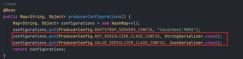 참고로 Kafka Producer는 Broker들에게 데이터를 보낼 때 Byte Array 형태로 처리하기 때문에 아래와 같이 Producer는 Serializer를 사용하여 메시지를 변환해야 하고, Consumer는 Deserializer를 사용하여 다시 원하는 자료형으로 데이터를 변환해주어야 합니다.