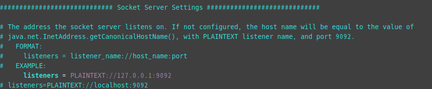 이제 kafka가 설치된 경로에서 server.properties에서 listeners 부분의 주석을 해제합니다. Broker가 사용할 호스트와 포트 번호를 지정한 것입니다.