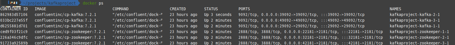 이제 작성한 yml 파일을 실행하고 컨테이너를 확인해보겠습니다. -d 옵션을 주게 되면 zookeeper, kafka를 daemon 환경에서 실행합니다.