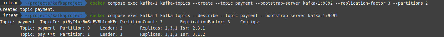 $ docker compose exec kafka-1 kafka-topics --create --topic payment --bootstrap-server kafka-1:9092 --replication-factor 3 --partitions 2