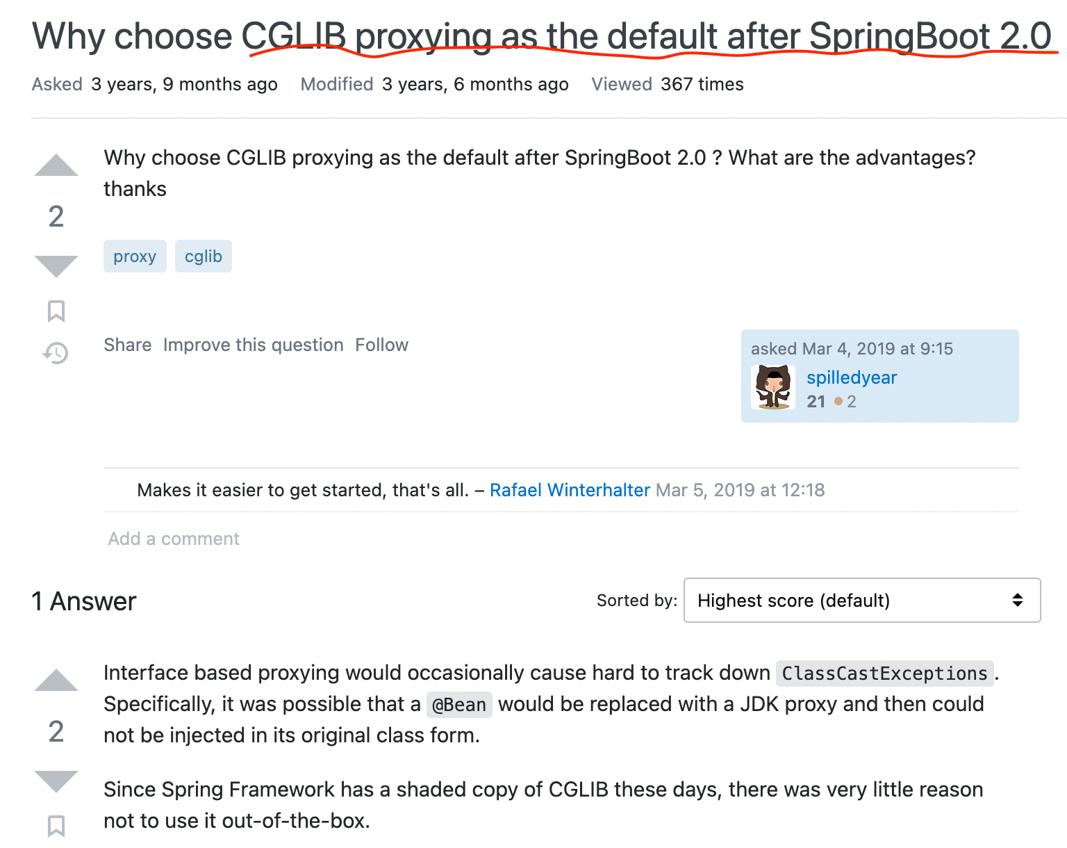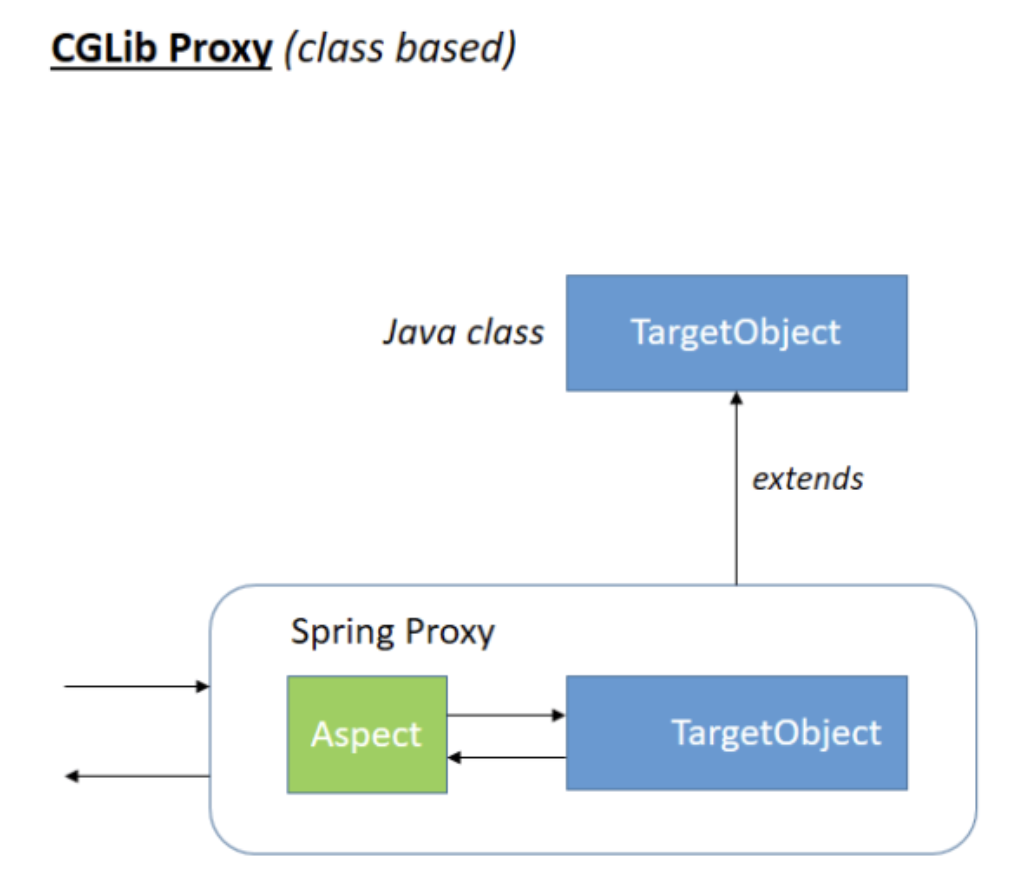 스프링 부트에서는 어떤 클래스를 Bean으로 등록할 때(AOP 적용을 위한 프록시 객체를 만들 때), 기본적으로 CGLIB라는 바이트 코드 조작 라이브러리를 사용해서 Target 클래스를 상속받은 임의의 다른 클래스를 만들고, 그 다른 클래스를 스프링 빈으로 등록합니다.