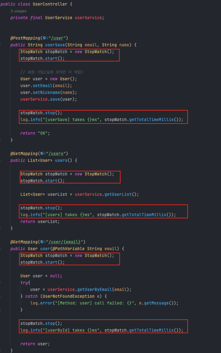 아주 간단한 코드지만, 아래 빨간색 박스로 표시한 것처럼 UserController에서 많은 양의 코드가 같은 내용(시간 측정)을 처리하는 데 반복적으로 사용되는 것을 확인할 수 있습니다.