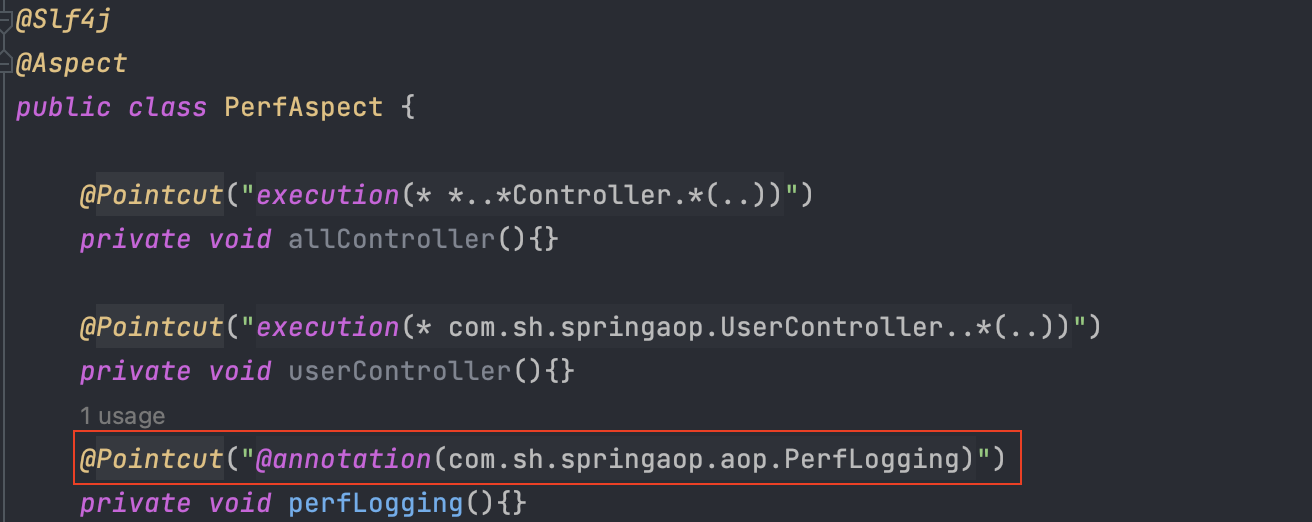 그리고 위에서 설명했던 것과 마찬가지로 com.sh.springaop.aop 패키지 아래에 PerfLogging이라는 Custom Annotation을 작성해주겠습니다.