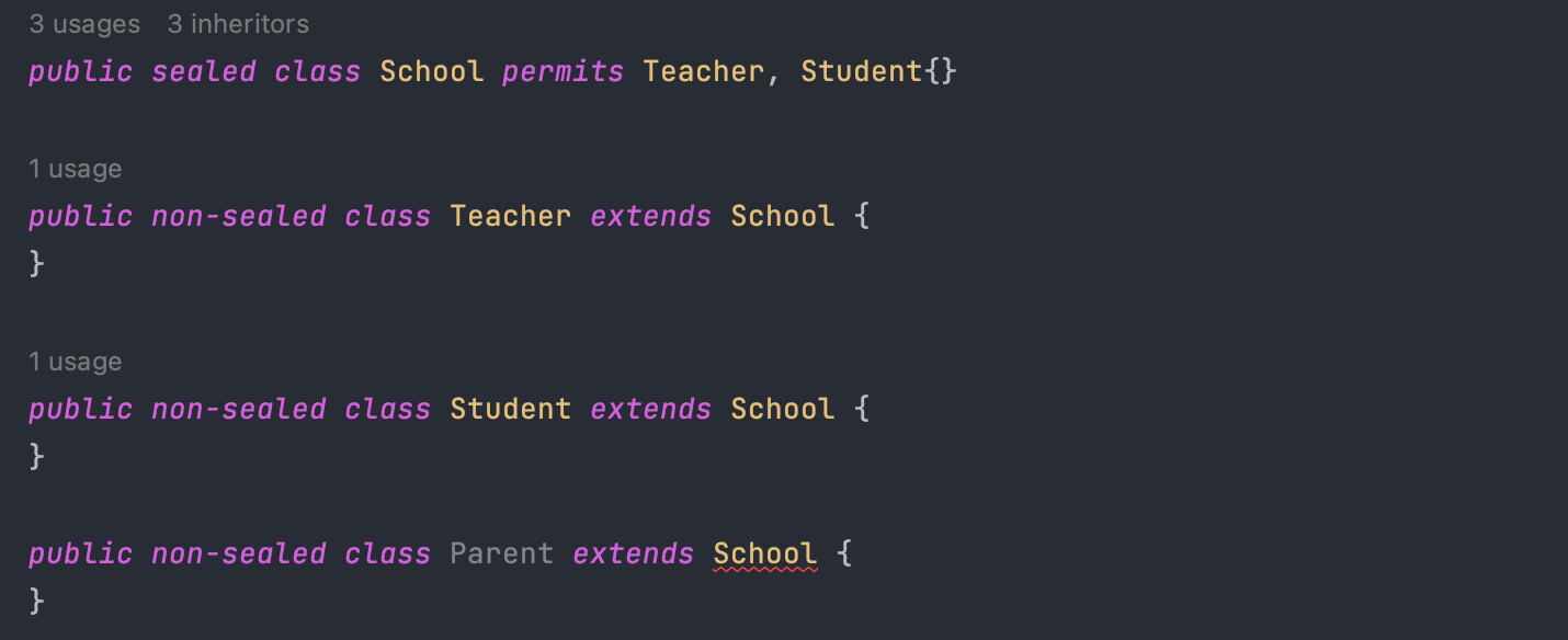 School 이라는 클래스는 Teacher, Student 두 클래스만 자신을 상속할 수 있도록 합니다. 즉, 자신을 상속할 수 있는 클래스를 미리 permits로 한정해둠으로써 무분별하게 상속되어 의도와 다르게 사용되는 상황을 방지하는 것이죠.