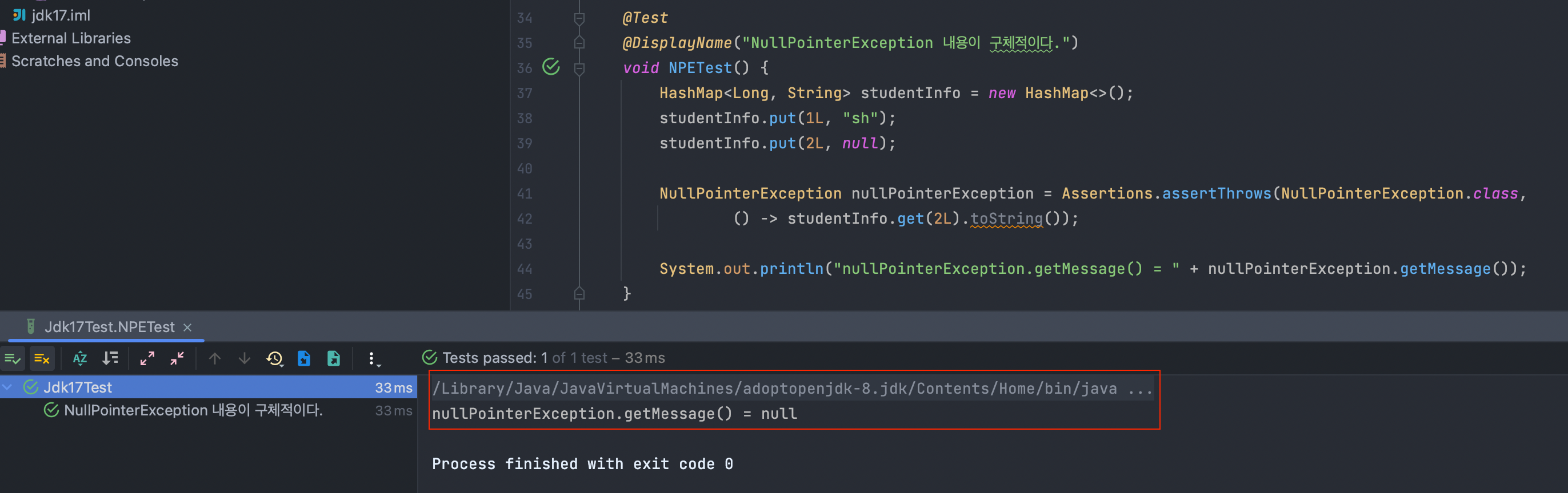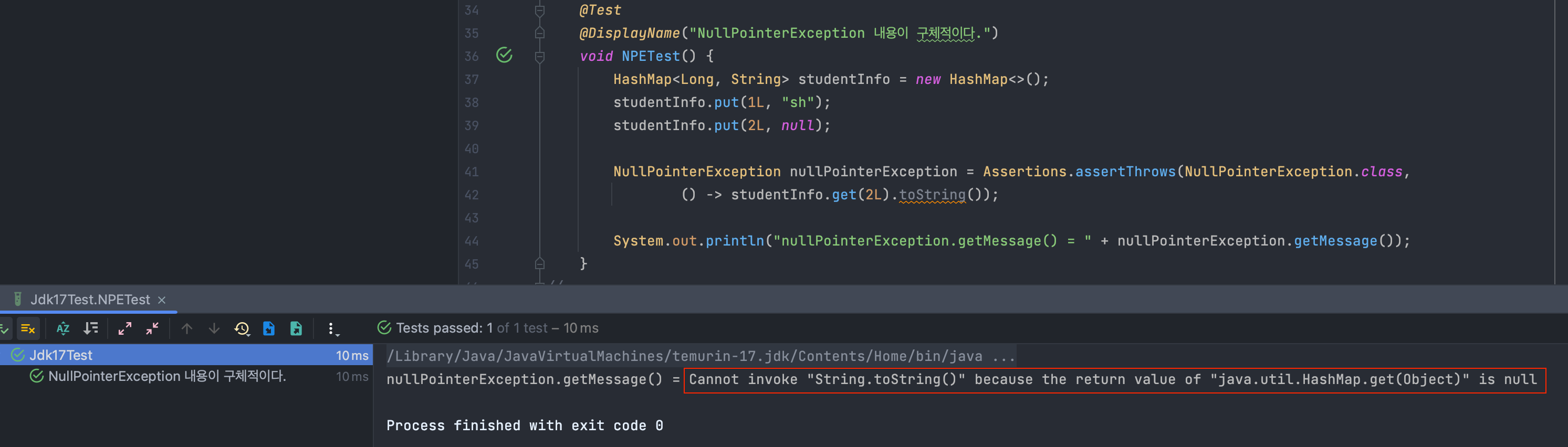 아래 테스트 코드는 NullPointerException을 발생하게 하고, 이에 대한 메시지를 출력하고 있습니다.