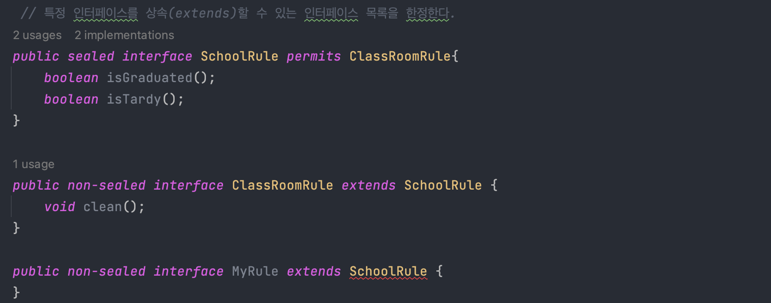 위 예시를 보면 SchoolRule 인터페이스는 isGraduated(), isTardy() 메서드를 가지고 있으며 sealed, permits 키워드를 통해 자신을 extends할 수 있는 인터페이스를 ClassRoomRule 인터페이스로 한정하고 있습니다.