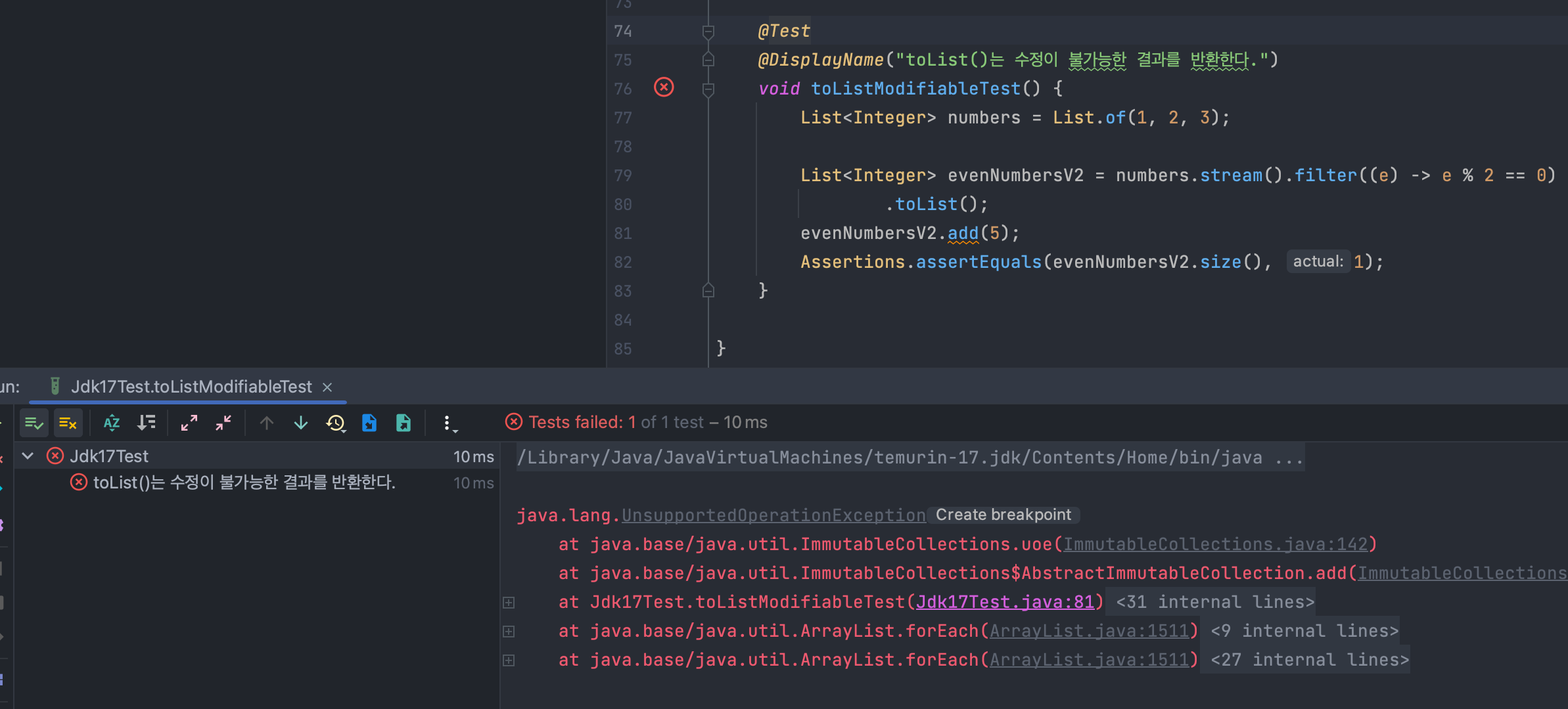 그런데 여기서 한 가지 더 기억해야 할 포인트는 .collect(Collectors.toList())와 .toList()의 결과값의 성질이 다르다는 것인데요.