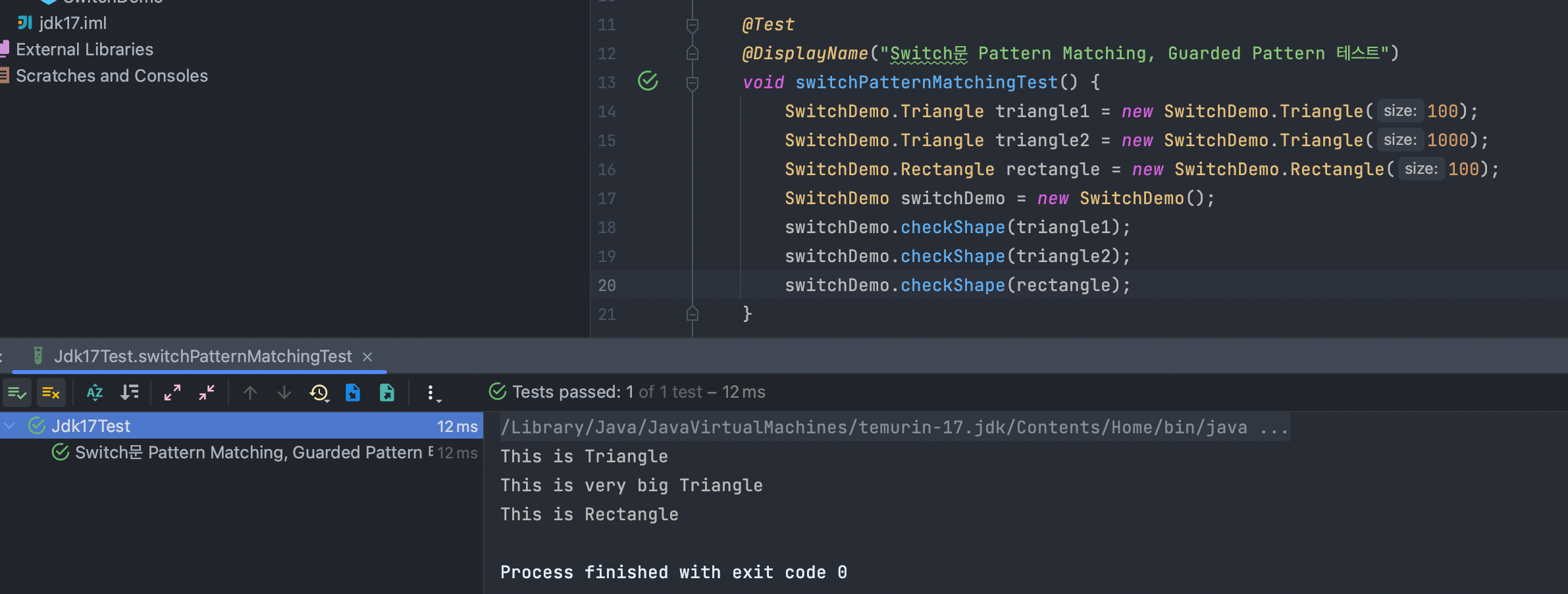 case Triangle t -> System.out.println("This is Triangle"); 부분을 보면 shape 자체가 어떤 클래스의 instance 인지를 체크하고 있죠. 이를 통해 더 간결한 코드를 짤 수 있게 되었습니다. - Pattern Matching