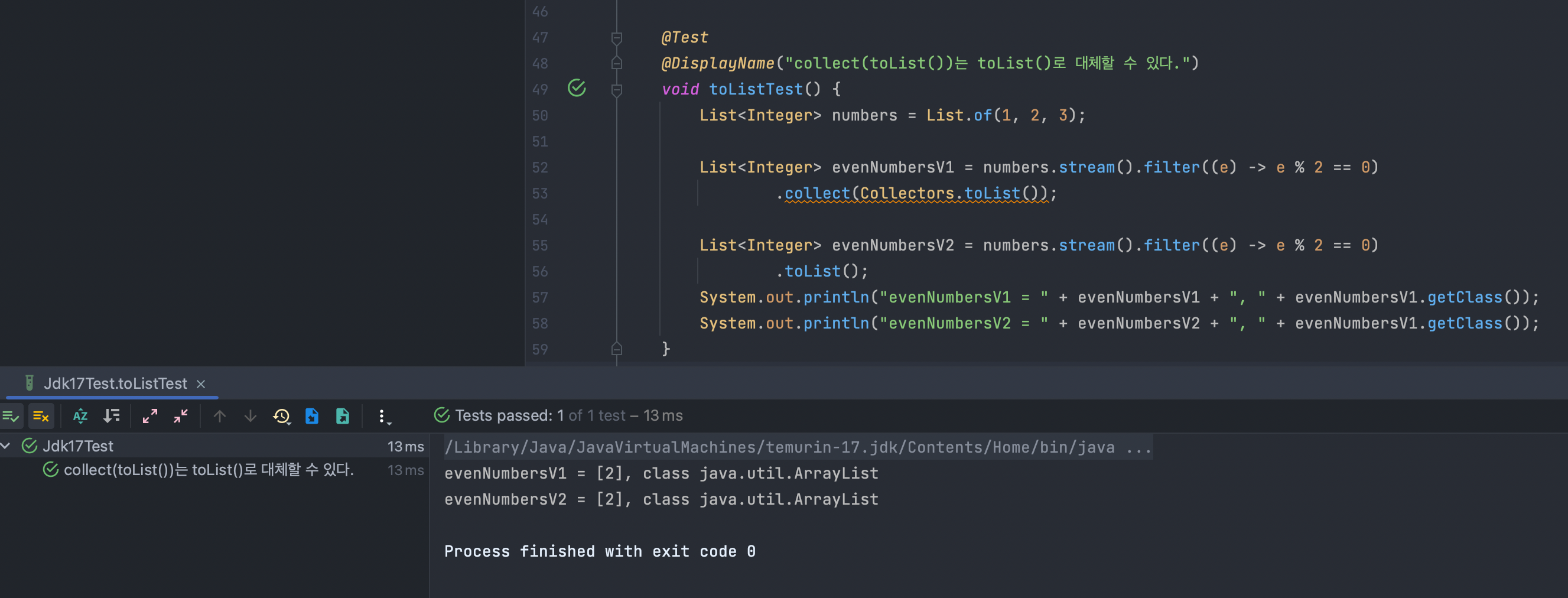 하지만 JDK 17 부터는 .toList()만으로 결과 리스트를 반환할 수 있게 되었습니다.