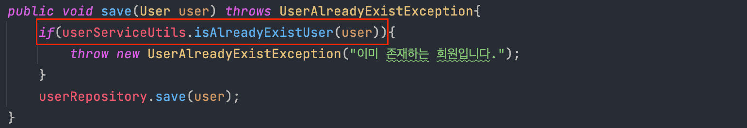그래서 위에서 isAlreadyExistUser() 메서드를 다른 클래스로 빼서 작성해보겠습니다.