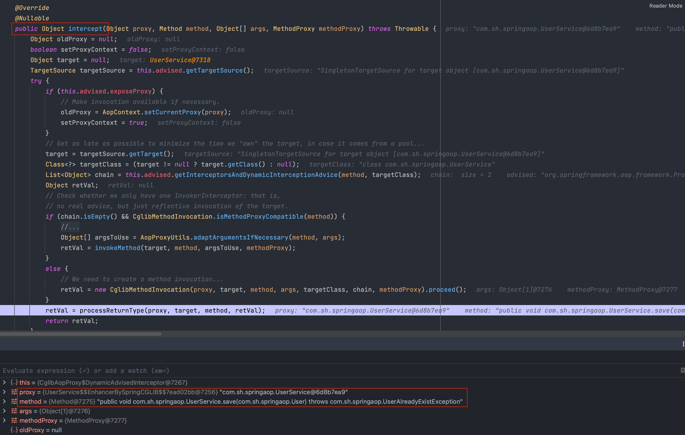 그러면 빨간색 상자로 표시한 것처럼 프록시 객체의 정보와 save() 메서드가 method 정보를 알 수 있습니다. 다시 Step into 하여 진행시켜보겠습니다.