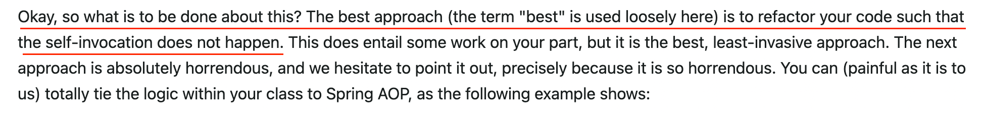 Spring 공식 문서에서는 위와 같은 문제의 해결책으로 "코드를 리팩토링하라"고 합니다. 즉, 내부 메서드 호출이 일어나지 않도록 만드는 것이 최선이라는 설명인데요.