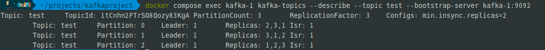 먼저, 위에서 제가 일부러 만든 URP 상황에서는 아래와 같은 CLI로 'test'라는 토픽을 특정하여 조회했고, ISR(In Sync Replica) : 1 임을 통해 문제가 발생했음을 확인할 수 있습니다.